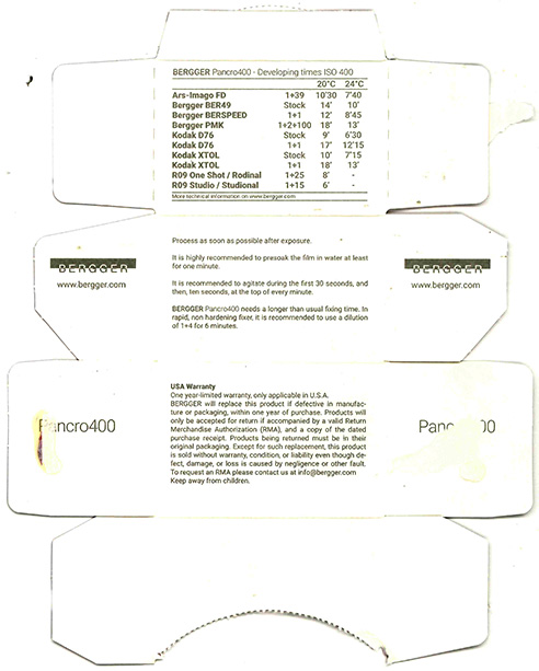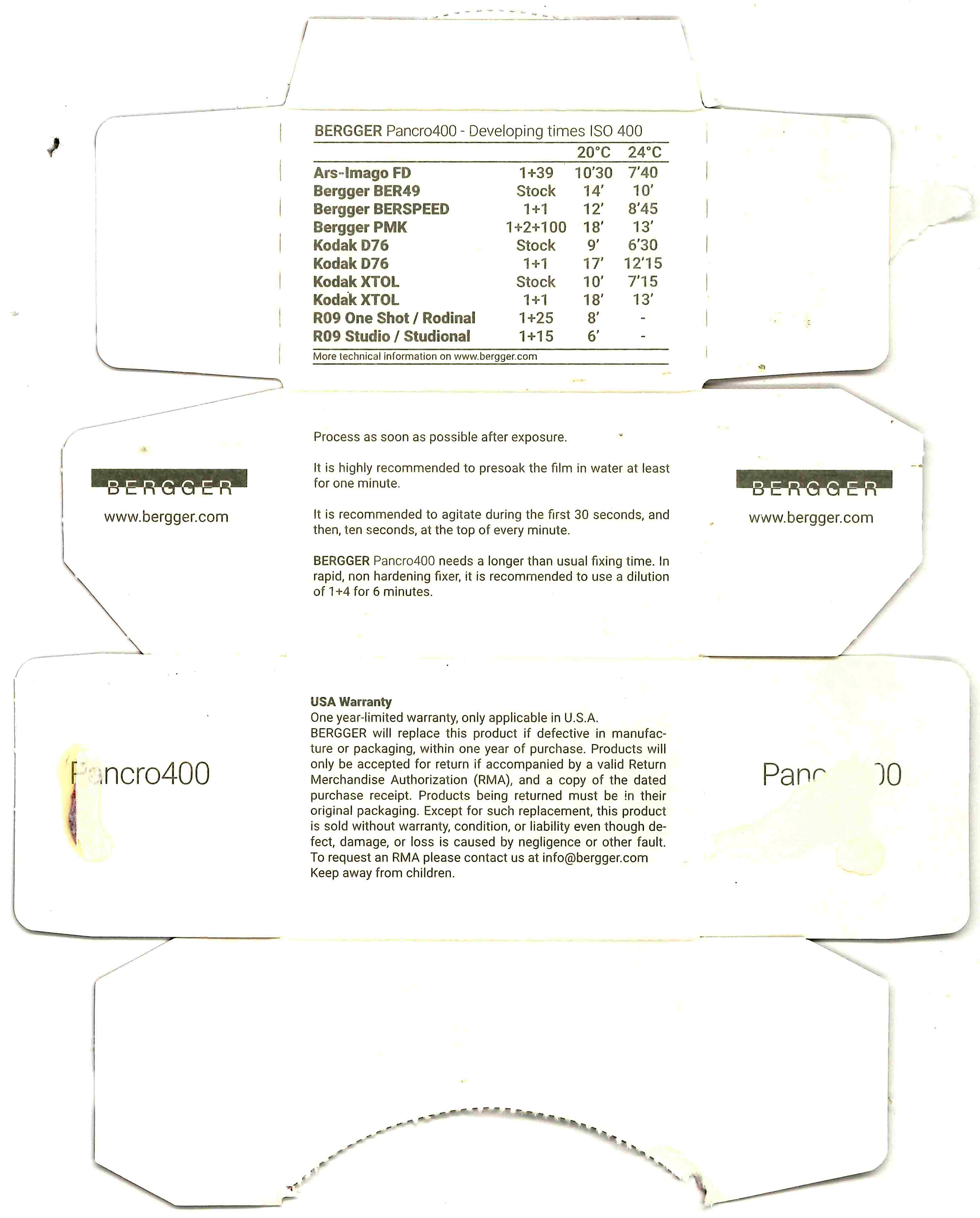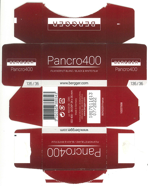 Pancro 400 is the only photography film produced by the French manufacturer Bergger. The emulsion contains both iodine and bromine silver halides; this mixture is intended to give the film a wider exposure latitude (i.e. flatter contrast) than other film while also keeping the fine grain. According to Bergger, Pancro 400 can be used from 100 to 1600 ISO and is best developed in their own chemicals [1].
